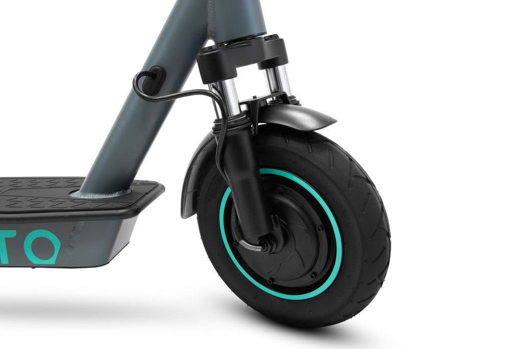 The 10" pneumatic tires provide the e-scooter with greater cushioning and grip than solid tires, ensuring a more comfortable and stable ride. The inner tube inside the tire allows for better shock absorption and greater adaptability to various road surfaces, thus contributing to a safer riding experience.
